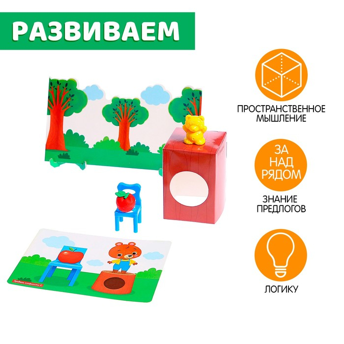 - Изучайте с крохой пространственные понятия: попросите его поставить мишку на стол, под стул, перед стулом. А затем расположите фигурки сами и спросите у малыша, где находится мишутка?