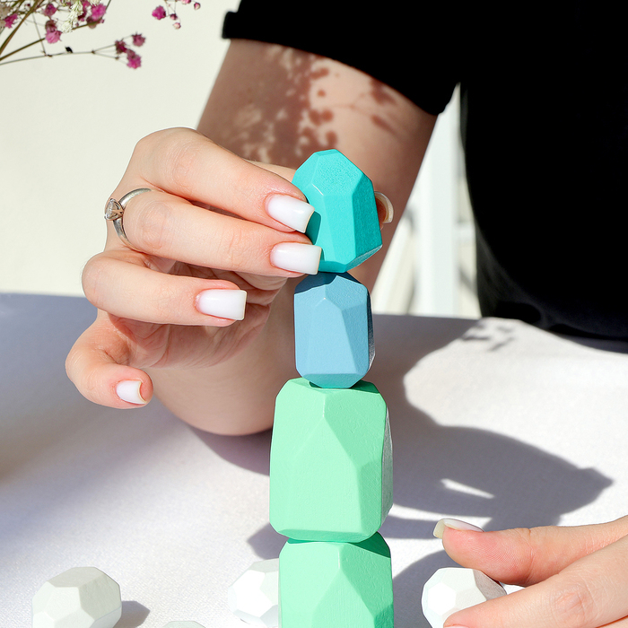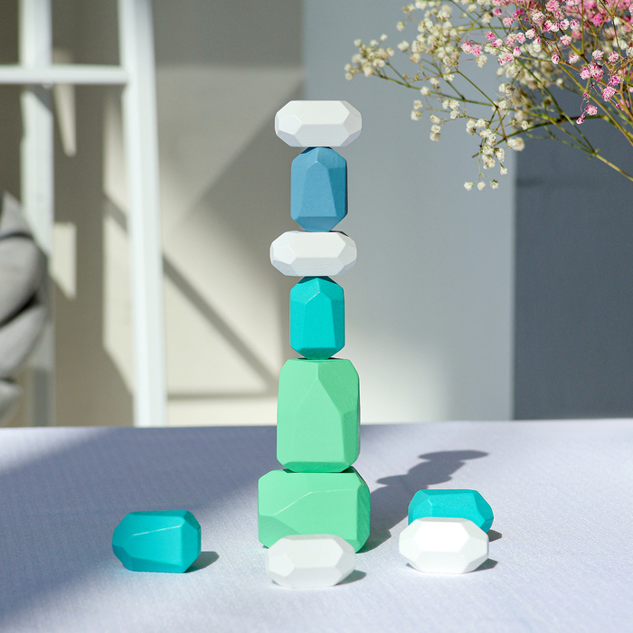 Набор «Речные камни» — это новый взгляд на классический строительный конструктор. В отличие от стандартных квадратных блоков, у этих элементов много сторон, поэтому строить из них башни сложнее и интереснее.
