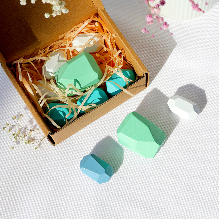 Все камни сделаны из экологичного материала — дерева — и покрыты безопасными красками. Грани блоков тщательно отшлифованы и не имеют зазубрин и сколов.