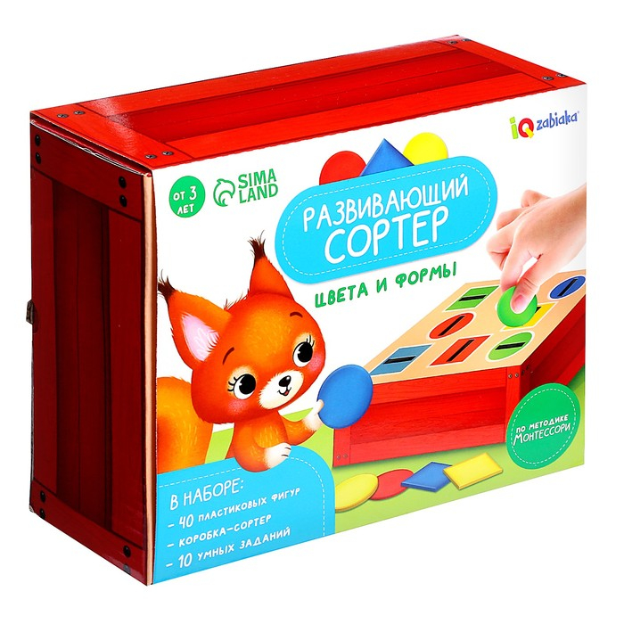 В комплекте есть 40 пластиковых фигур, коробка-сортер и 10 логических заданий.