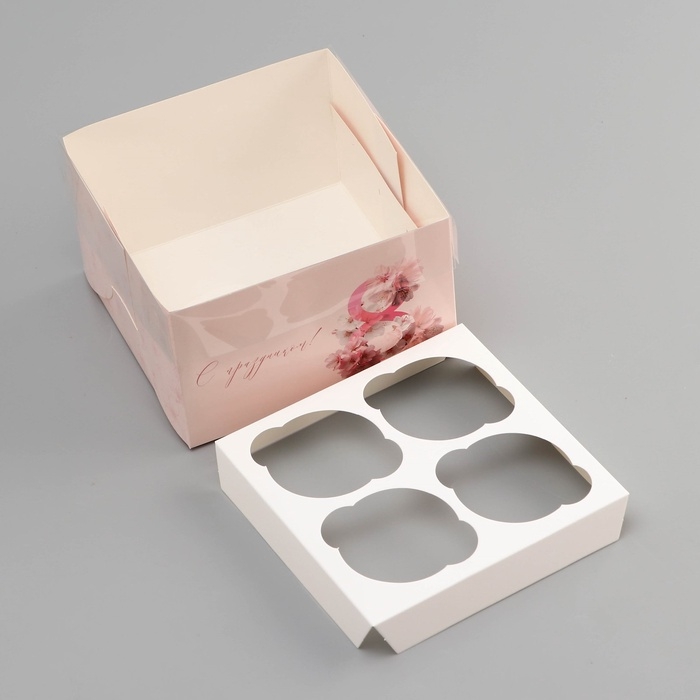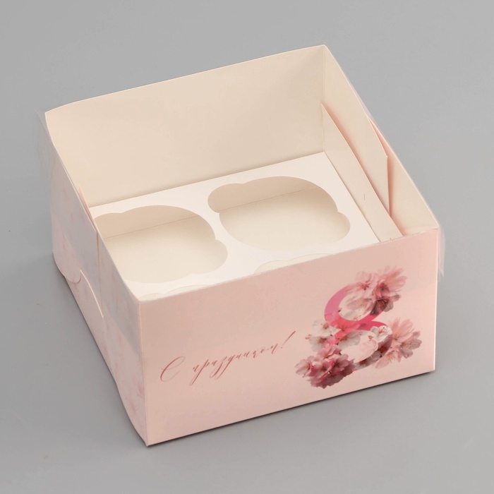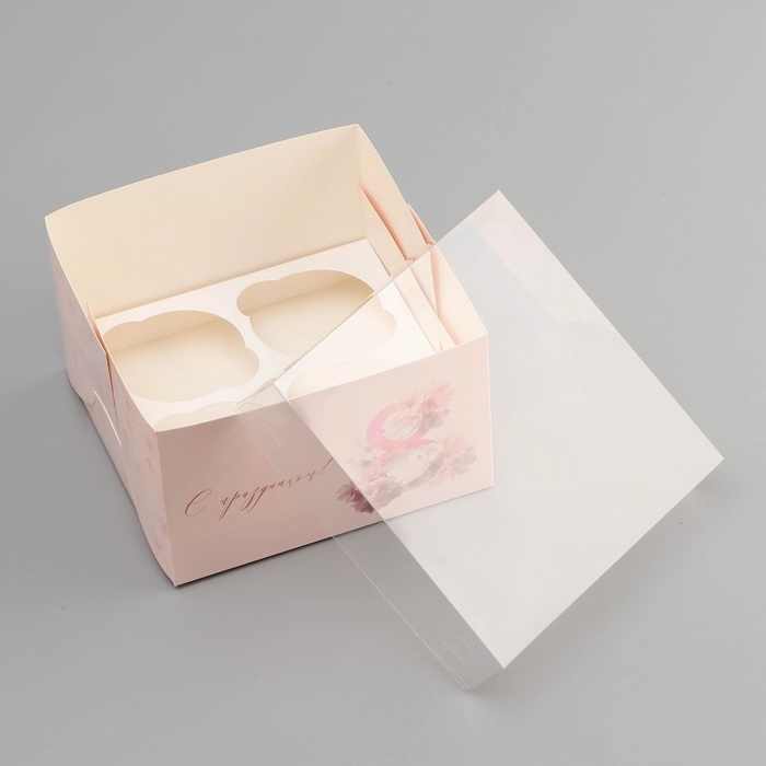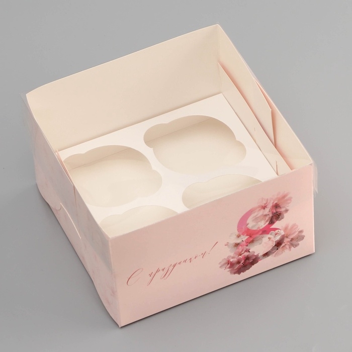 Коробка для 4 капкейка с прозрачной крышкой, "8 марта", 16 × 16 × 10 см, кондитерская упаковка