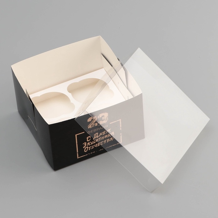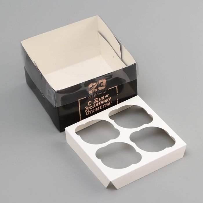 Коробка для 4 капкейка с прозрачной крышкой, "С днем защитника Отечества", 16 × 16 × 10 см, кондитерская упаковка