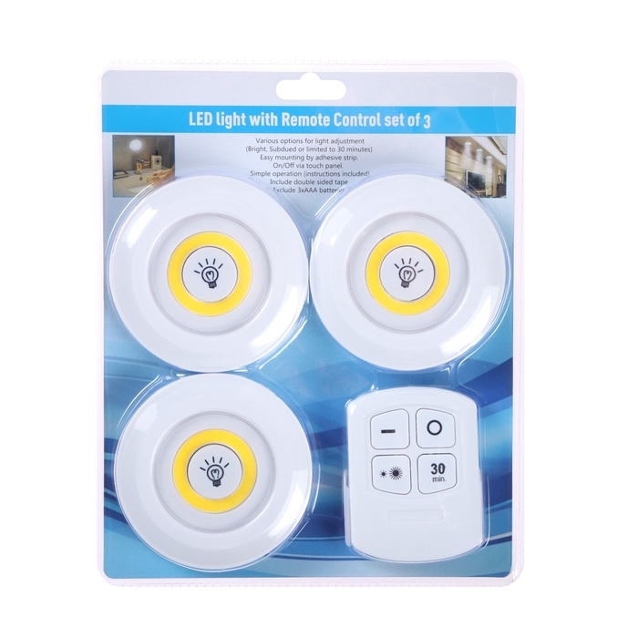 Светильник светодиодный, нажимной 4000К, от батареек, набор из 3 шт, пульт в комплекте