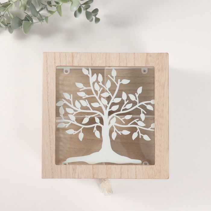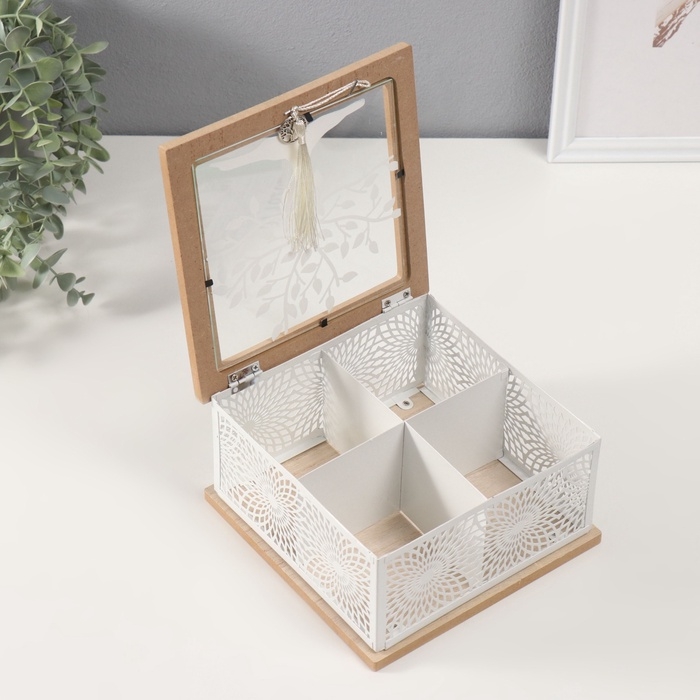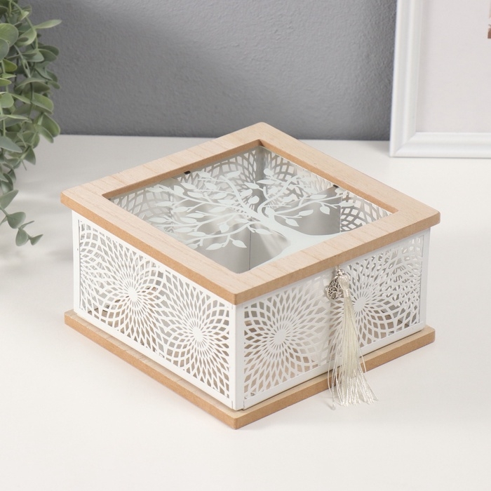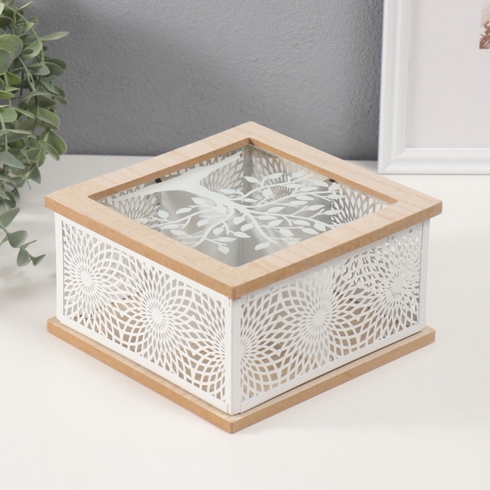 Шкатулка дерево, металл с делениями "Дерево и солнечные узоры" 18,3х18,3х10 см