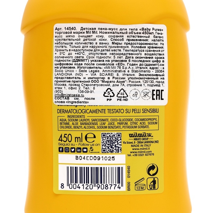 Детская пена-мусс для тела Baby Pures MILMIL, 450 мл