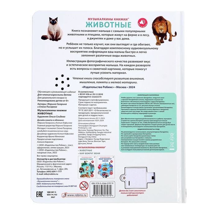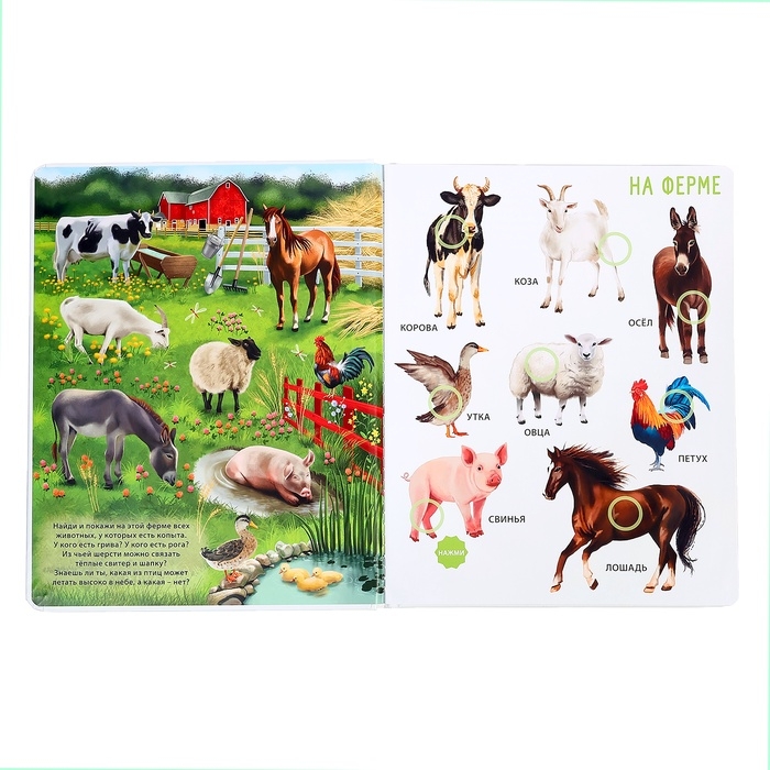 Книга «Животные» познакомит малыша с самыми популярными животными и птицами, которые живут на ферме и в лесу, в джунглях и даже у вас дома. Ребёнок не только изучит, как они выглядят и где обитают, но и услышит их голоса. Благодаря комплексному аудиовизуальному восприятию информации ваш малыш быстро и легко запомнит различные виды животных.