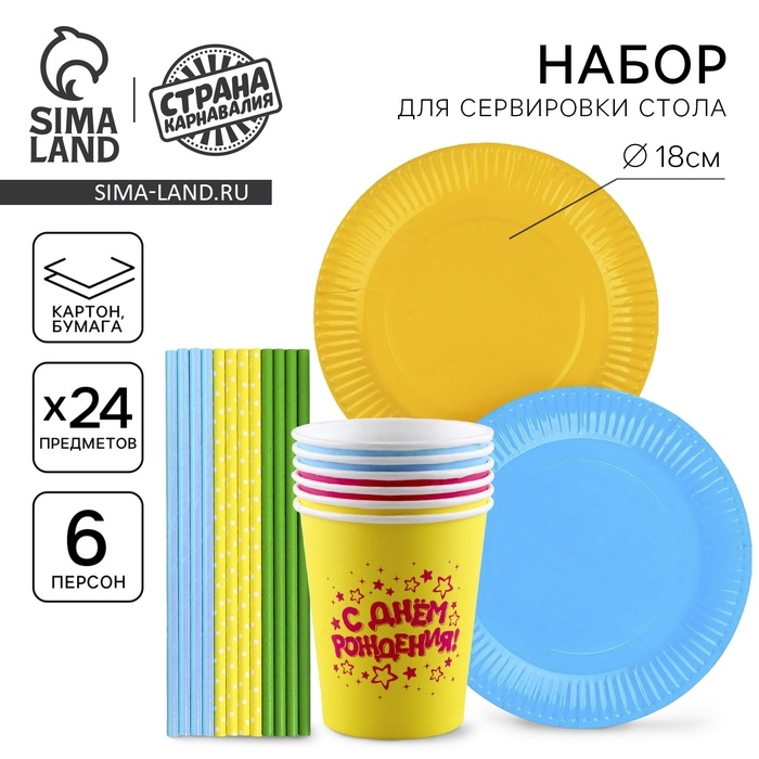 Набор бумажной посуды «С днём рождения»: 6 стаканов, 6 тарелок, трубочки