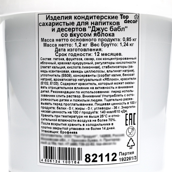 "Джус бабл" яблочного вкуса – это удивительное угощение, которое придаст вашим напиткам и десертам не только яркий цвет, но и неповторимый фруктовый вкус! Упакованная в большом объеме 1200 г, эта посыпка идеально подходит для использования в кафе, ресторанах или на домашних праздниках.