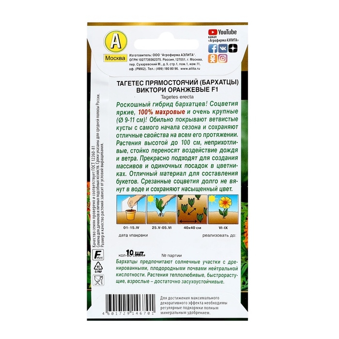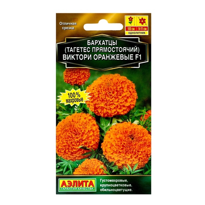 Семена цветов Бархатцы "Виктори оранжевые" F1, прямостоячие, ц/п, 10 шт