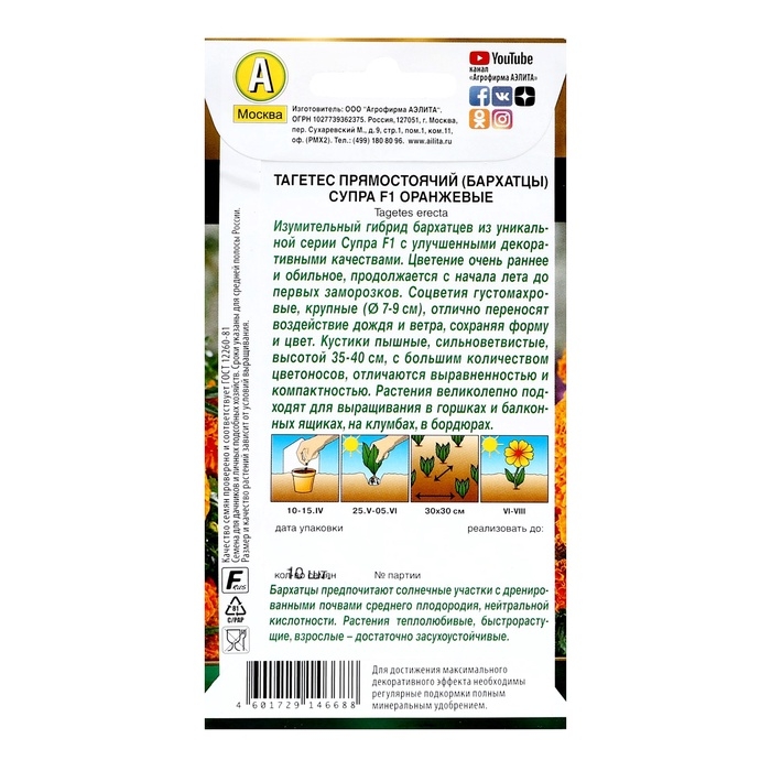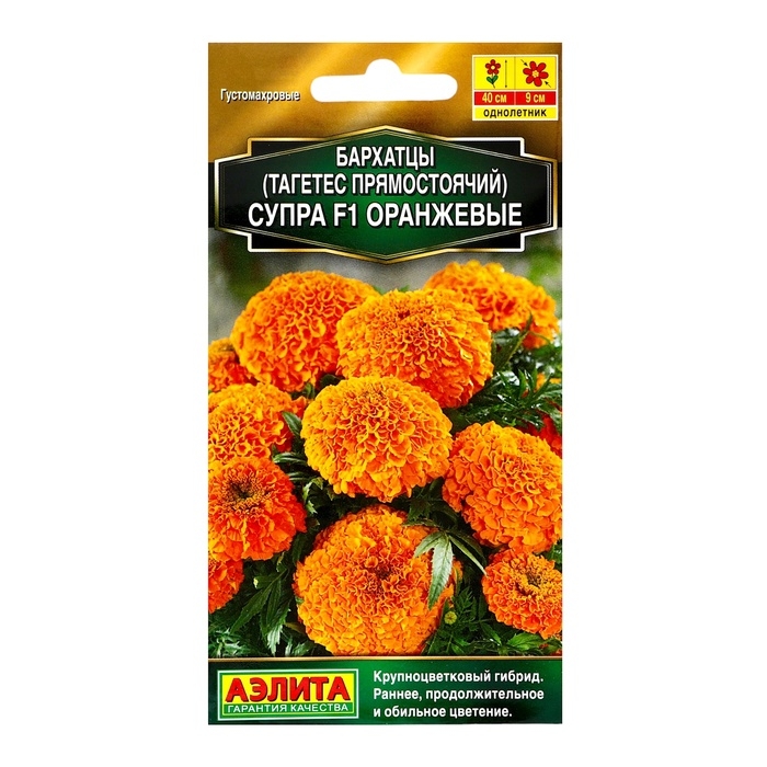 Семена цветов Бархатцы "Супра оранжевые" F1, прямостоячие, ц/п, 10 шт