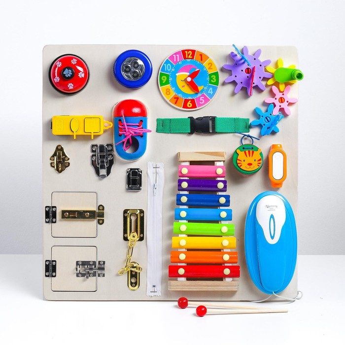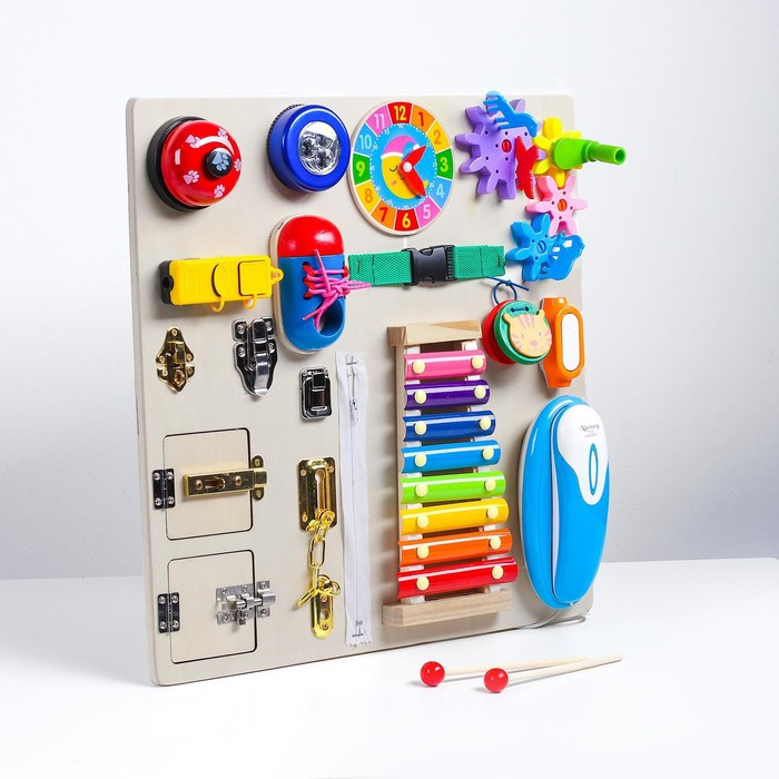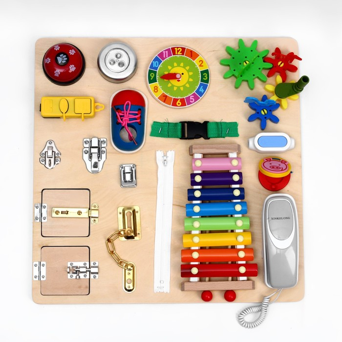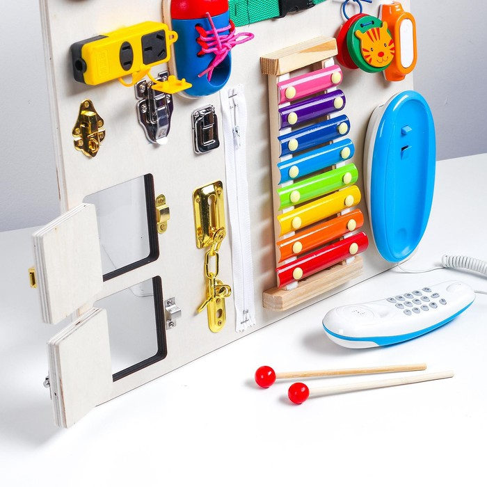 Бизиборд «Сказка» — это развивающая доска, к которой прикреплены замочки, шпингалеты, шестерёнки, розетка, шнуровка, металлофон, часики, молния, телефон.