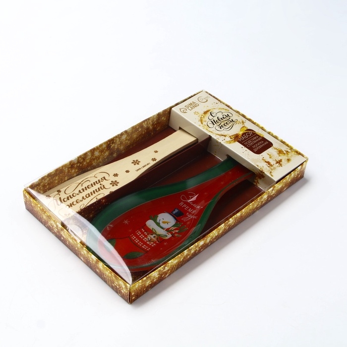 Подарочный набор состоит из стеклянной подставки под ложку размером 21,4 x 7,5 x 2 см и деревянной лопатки.