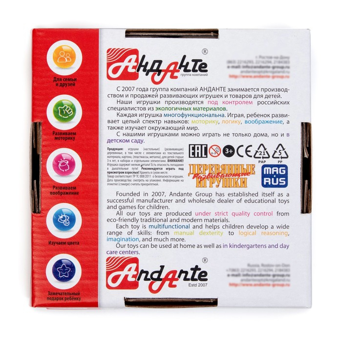 Внимание! Детали набора выполнены из натурального дерева без покрытия лаками или другими химическими составами. Возможно появление мелких фракций дерева. Во избежание заноз, перед использованием удалите остатки древесины и древесную пыль, тщательно протерев детали игрушки мягкой тканью.
