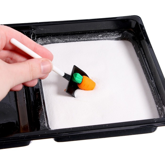 Подготовьте сенсорную коробку: высыпьте песок в большой отсек, а овощи — в маленький.