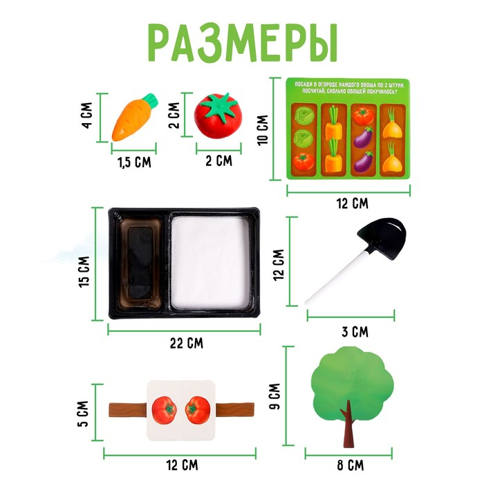 Вместе с ребёнком посадите огород, добавьте фигурки животных, сделайте забор из прищепок. А когда урожай взойдёт, соберите фрукты и овощи лопаткой!