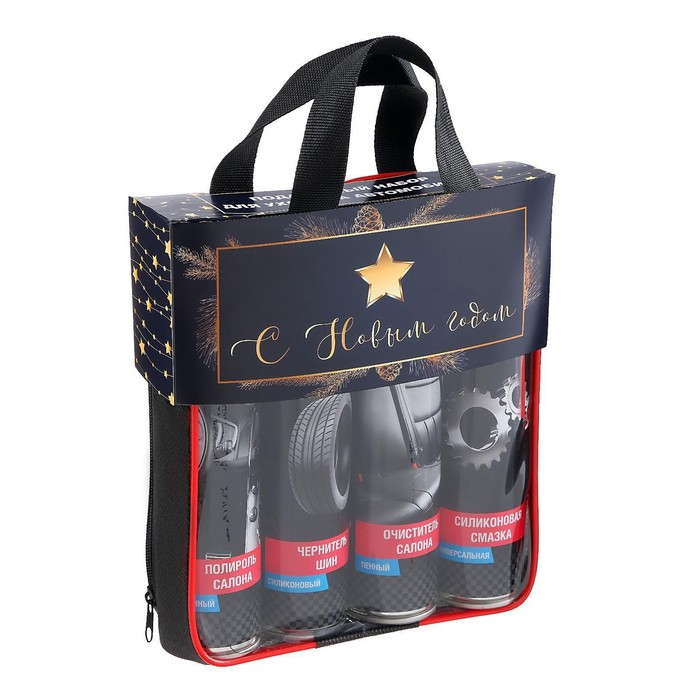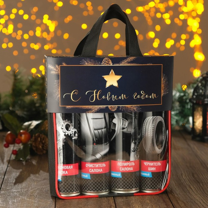 Новогодний подарочный набор для ухода за авто "С новым годом!", набор автохимии: силиконовая смазка 400 мл, полироль пластика 400 мл, очиститель салона 400 мл, чернитель шин 400 мл + микрофибра