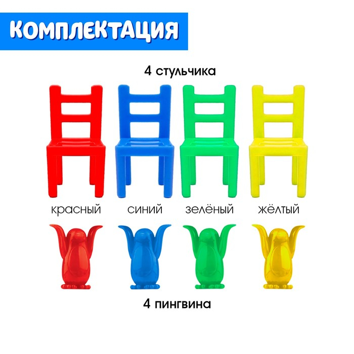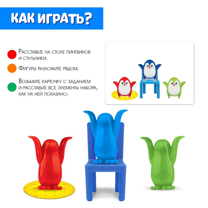 С настольной игрой «Пингвины и стульчики» малыш получит много новых и полезных знаний! Малыша ждут птички с яркими ковриками разных форм и весёлые задания на карточках.