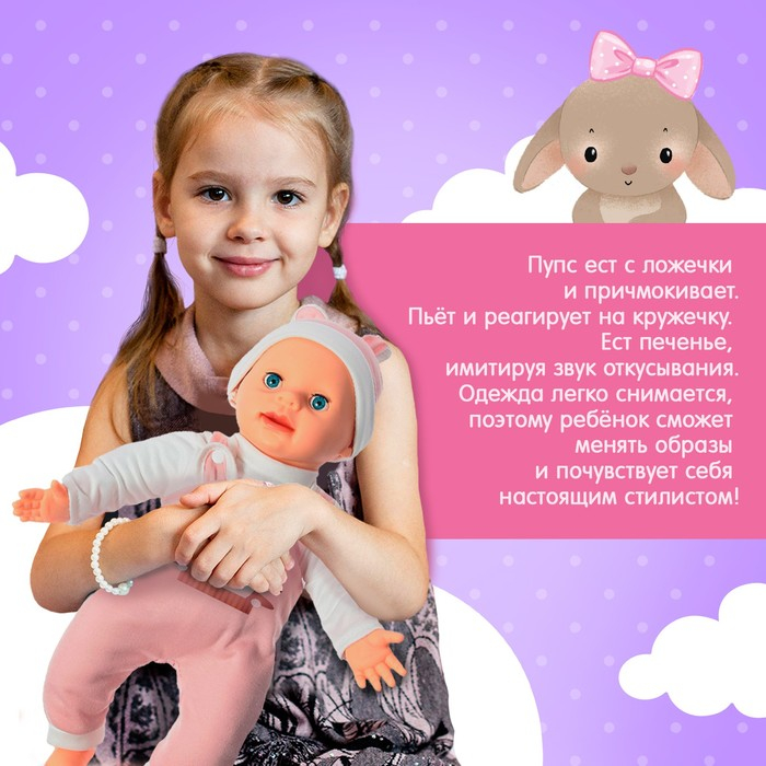 - Пупс ест с ложечки (причмокивает), пьёт (имитация, реагирует на кружечку), ест печенье (звук откусывания, если поднести печенье).