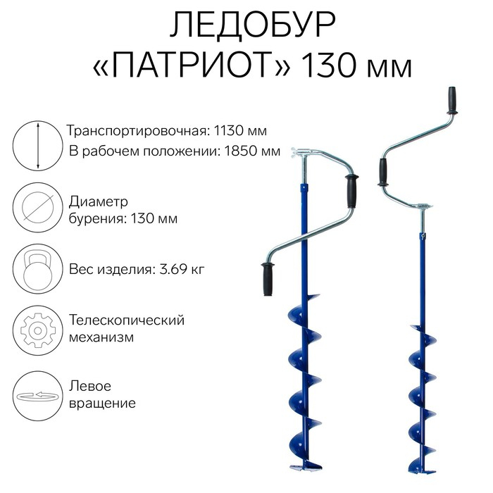 Ледобур «Патриот» — это инструмент, предназначенный для создания отверстий во льду для зимней рыбалки. Он изготовлен из высококачественной стали, что обеспечивает его прочность и долговечность. Ледобур оснащен острыми ножами, которые легко справляются с любым типом льда. Благодаря компактным размерам и малому весу, его удобно транспортировать и хранить.