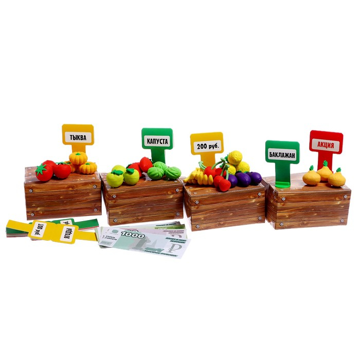 Перед началом игры соберите витрины магазина. Разложите на них фрукты и овощи, сортируя по категориям или цветам. Попросите ребёнка подобрать к каждому товару верный ценник.