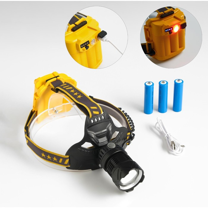 Фонарь налобный аккумуляторный, 1000 мАч, 5 Вт, 3 LED, 4 режима, USB