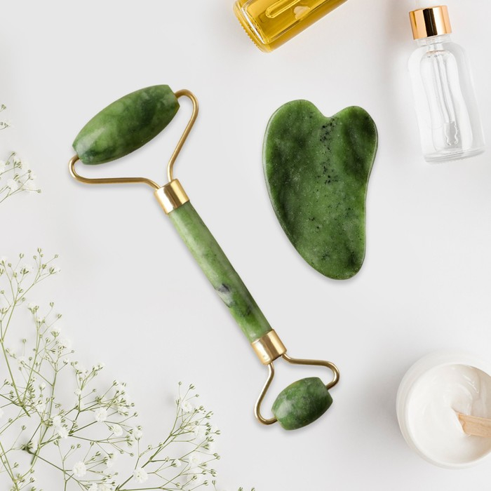Набор с массажёрами для лица и зоны декольте поможет держать ваше тело в тонусе. В набор входит роликовый массажёр из кальцита и серпентина и массажёр гуаша.