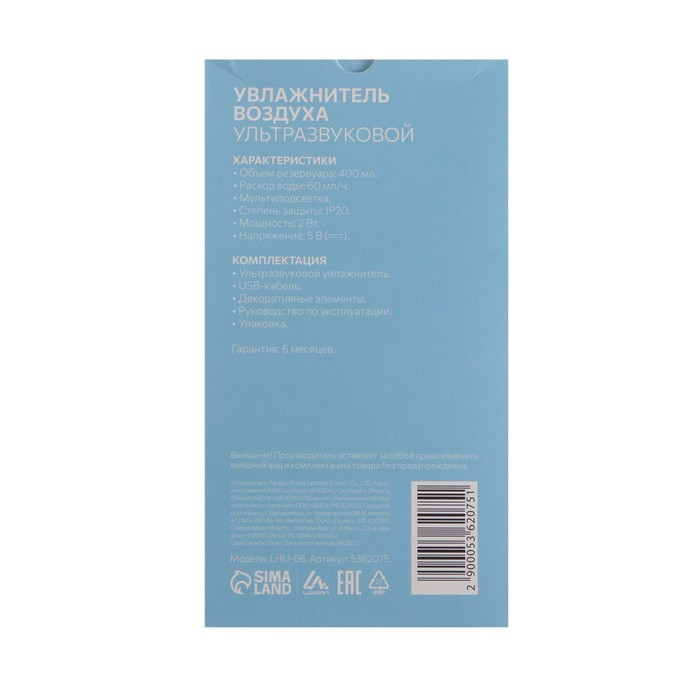 LuazON LHU-06 – это компактный увлажнитель воздуха, который удобно взять с собой в автомобиль или в офис. Устройство создаёт здоровый, чистый и увлажнённый воздух вокруг. Уникальный яркий дизайн изделия понравится детям и отлично впишется в интерьер. Наличие USB-провода позволяет работать устройству от ноутбука, прикуривателя или портативного аккумулятора. Расположите устройство рядом с рабочим местом и не переживайте о сухом воздухе. С помощью ультразвука прибор выбивает мельчайшие капельки с поверхности воды, образуя туман. Он распространяется по всей площади помещения и повышает относительную влажность воздуха. Ёмкость устройства составляет 400 мл. Этого хватит на 6 часов бесперебойной работы без дополнительного пополнения воды.