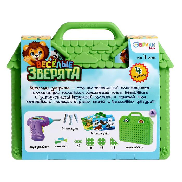 Конструктор в чемоданчике «Весёлые зверята», с электрическим шуруповёртом, 4 карточки, 57 деталей
