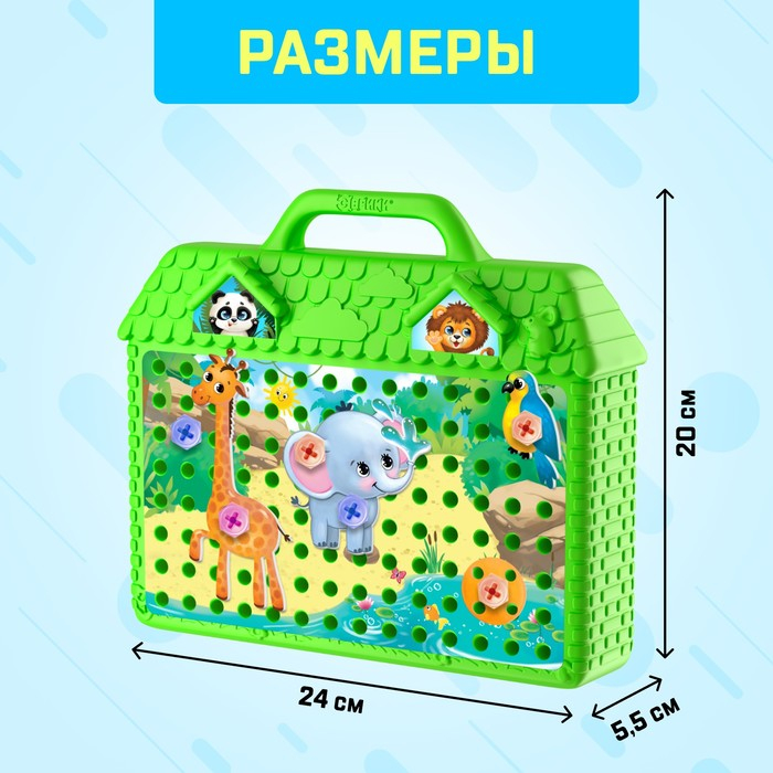 Увлекательный конструктор-мозаика — то, что надо маленьким любителям всего необычного! Задача малыша: вкручивать болтики и собирать картинки с помощью игровых полей и красочных фигурок.