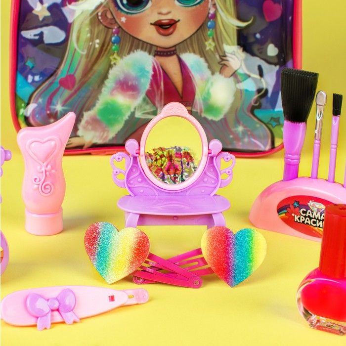 Игровой набор в рюкзачке «Модница» включает несколько расчёсок, плойку для создания волшебных локонов, заколочки, украшения, косметику, зеркальце.