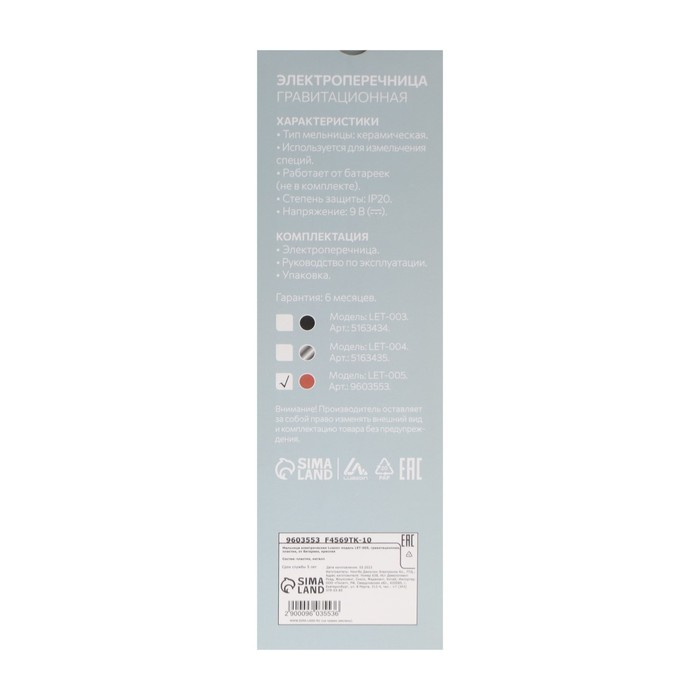 Мельница электрическая для специй «Живи со вкусом», модель LET-003, 22,3 х 5,2 см