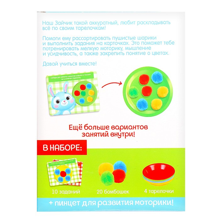 - Разложите бомбошки по тарелочкам в соответствии с их цветами.