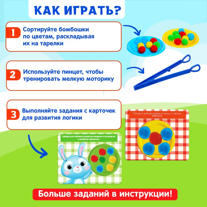 Игра создана для тренировки мелкой моторики, обучению цветам и счёту. Малыш сначала пальчиками, а потом с помощью пинцета будет раскладывать бомбошки по отделениям. Процесс можно усложнять, добавлять новые задания.