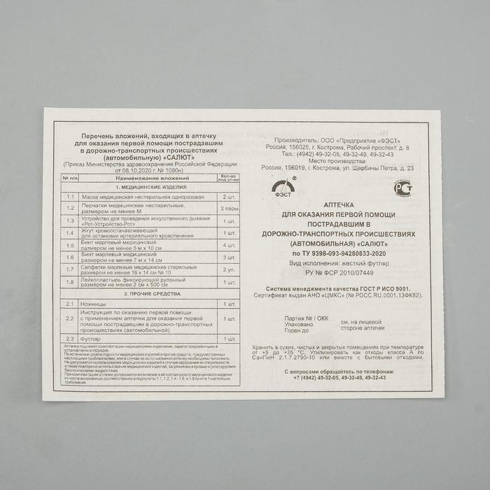Автомобильная аптечка первой помощи "Салют" состав 2024,