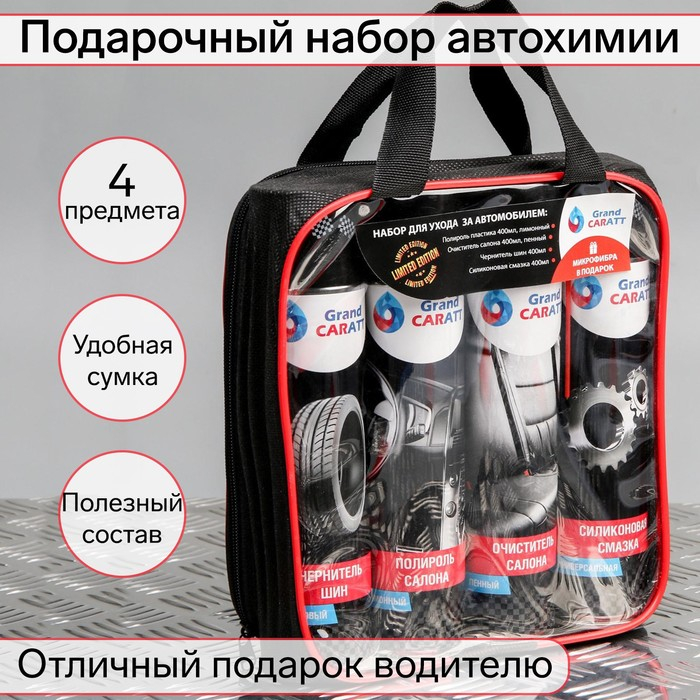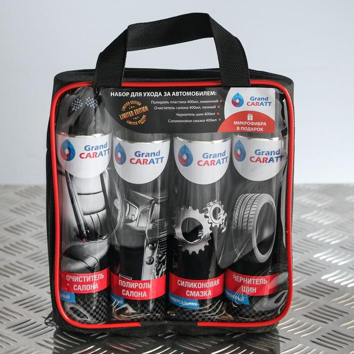 Подарочный набор для ухода за авто Grand Caratt, набор автохимии: силиконовая смазка 400 мл, полироль пластика 400 мл, очиститель салона 400 мл, чернитель шин 400 мл + микрофибра