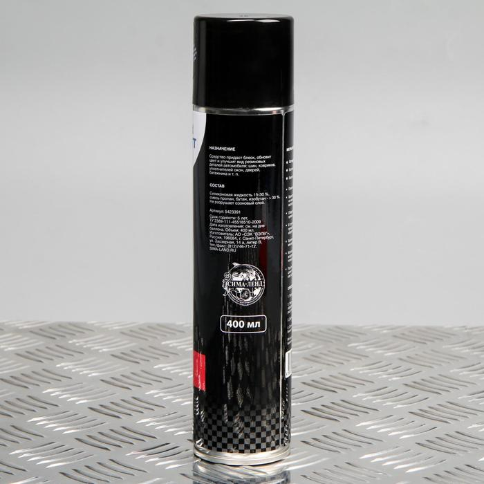 Придаст матовый блеск, обновит цвет и улучшит вид резиновых деталей автомобиля: шин, ковриков, уплотнителей окон, дверей, багажника и т.п. Средство имеет приятный аромат.