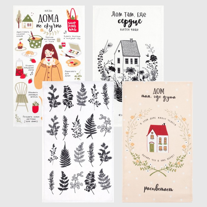 Набор кухонных полотенец Доляна «Дом там где сердце» 35х60см-4шт, 100% хлопок