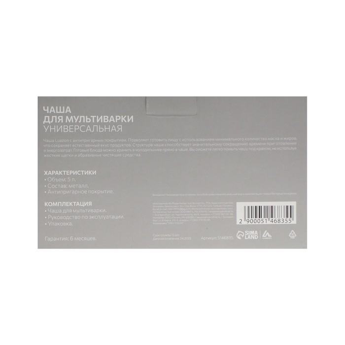 Чаша для мультиварки LuazON объемом 5 литров имеет антипригарное покрытие. Это позволяет использовать минимальное количество масла и жира при готовке. Легко очищается. Можно хранить прямо с едой в холодильнике.