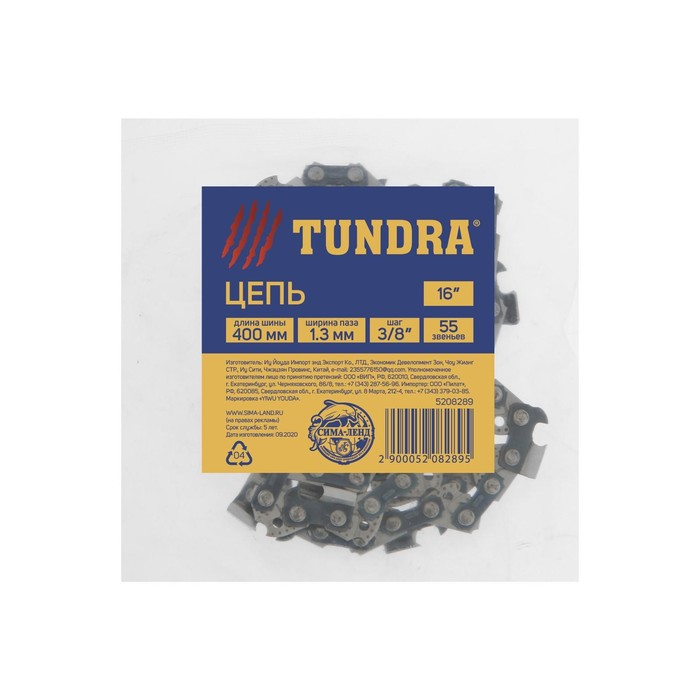 Цепь ТУНДРА, 16", 400 мм, ширина паза 1.3 мм, шаг 3/8", 55 звеньев