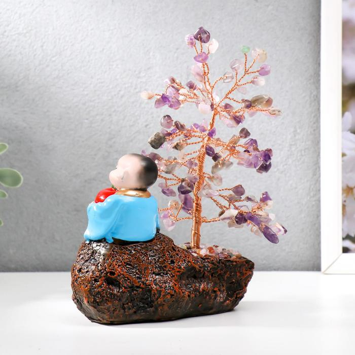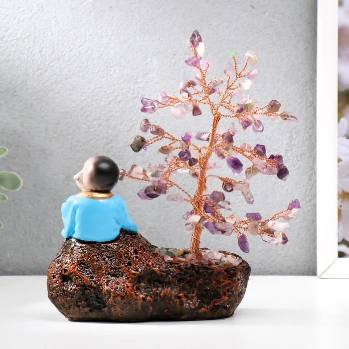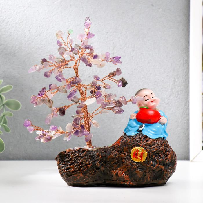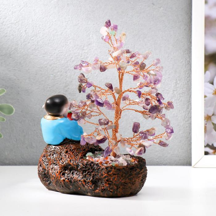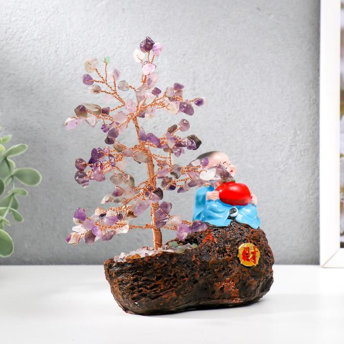 Сувенир бонсай 147 камней "Хотей с яблоком у дерева с аметистами" 18х13х6 см