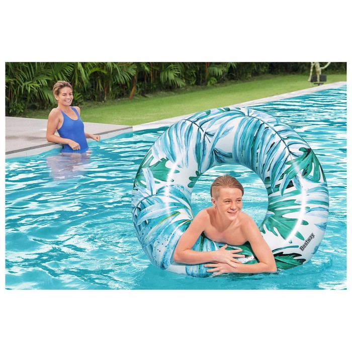 Круг подойдёт для плавания в бассейнах и открытых водоёмах. Модель украшена реалистичным тропическим принтом.