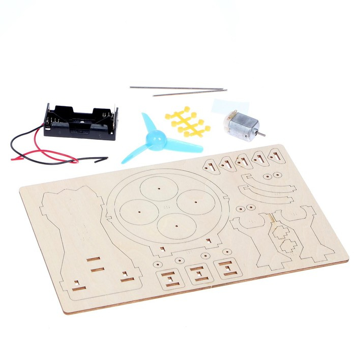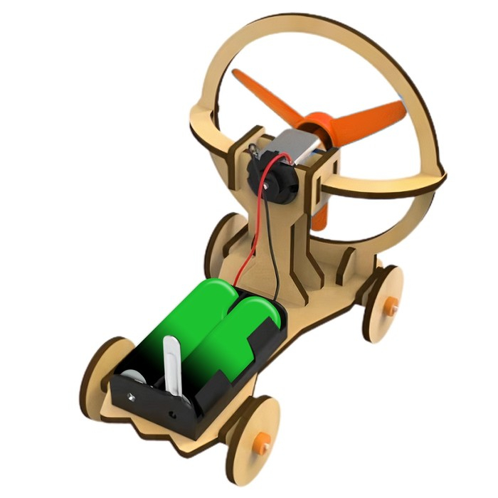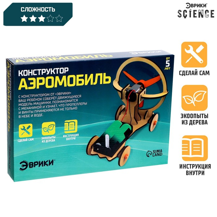 Электронный конструктор из дерева позволит ребёнку собрать подвижную модель аэромобиля. Малыш познакомится с механикой и узнает, что пропеллеры и винты применяются не только в воде, но и в небе.