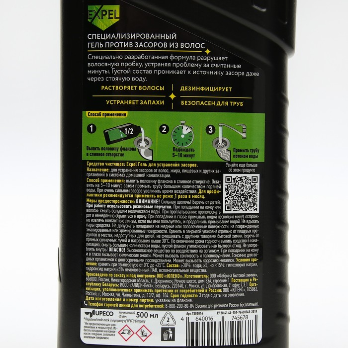 Средство от засоров в ванной, EXPEL ВОЛОСОГОН, гель, 500 мл