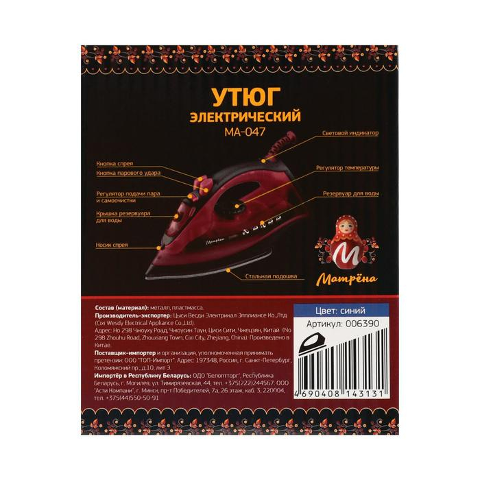 Утюг "МАТРЁНА" MA-047, 2200 Вт, стальная подошва, синий