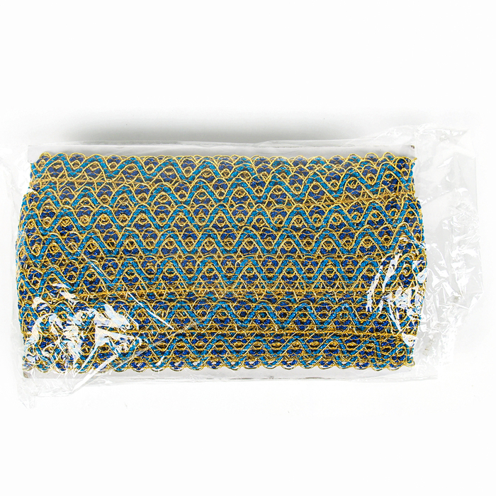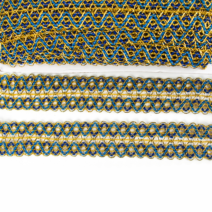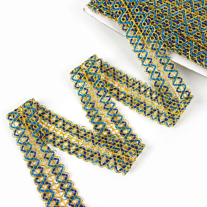 Тесьма «Зигзаг», ширина 3,5 см., в рулоне 25 м., сине-голубо-золотая