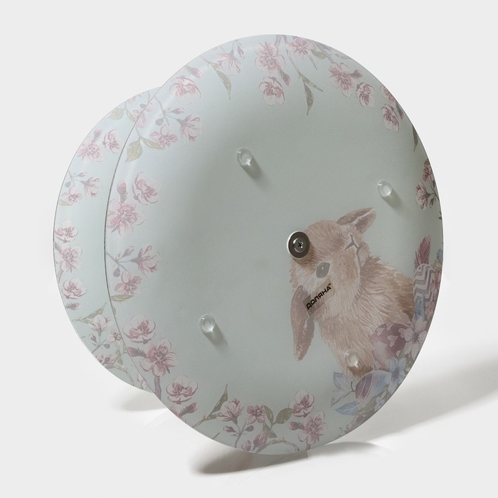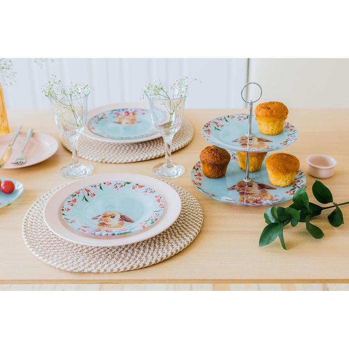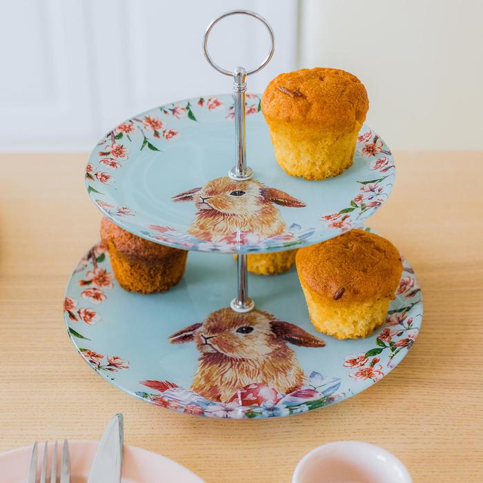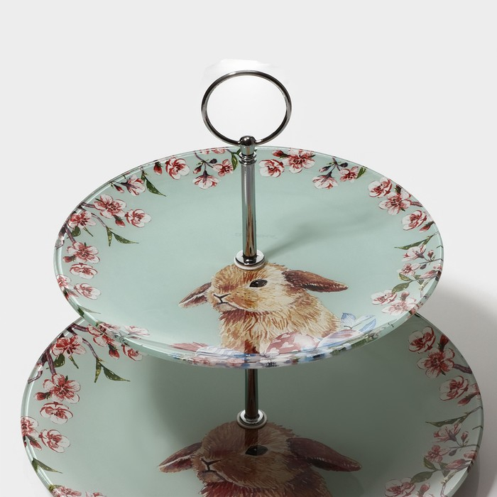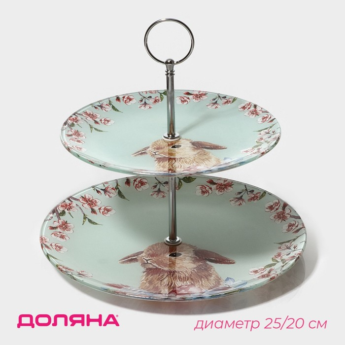 Фруктовница стеклянная 2-х ярусная круглая Доляна «Кролик», d=25/20 см, цвет голубой