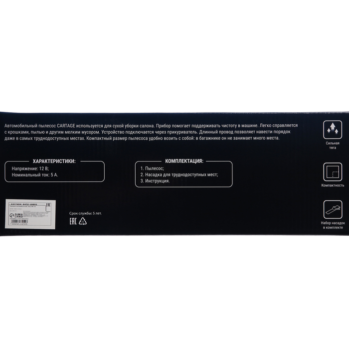 Пылесос автомобильный CARTAGE TURBO, беспроводной, 120 Вт, 12 В, LED подсветка, черный
