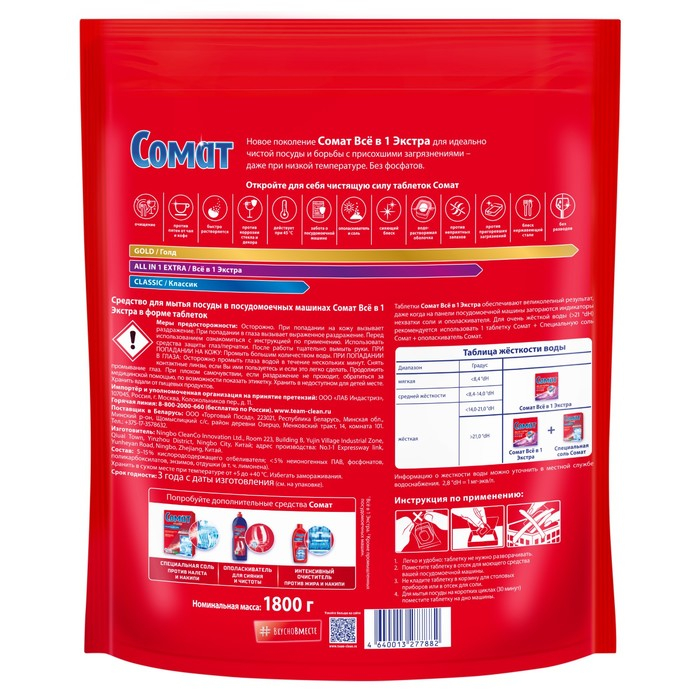 Таблетки для посудомоечной машины Сомат Всё в 1 Экстра содержат 10 активных действий, которые обеспечивают великолепное очищение Вашей посуды даже против таких трудных загрязнений, как присохшая еда, и заботятся о посудомоечной машине. Ослепительная чистота посуды без лишних усилий от Сомат!