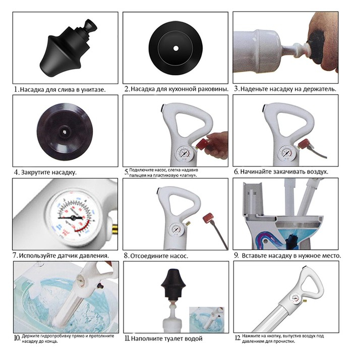 Гидропробивка труб работает за счёт сжатого воздуха. За счёт мощного потока он легко проталкивает волосы и грязь по трубе, и засор исчезает.