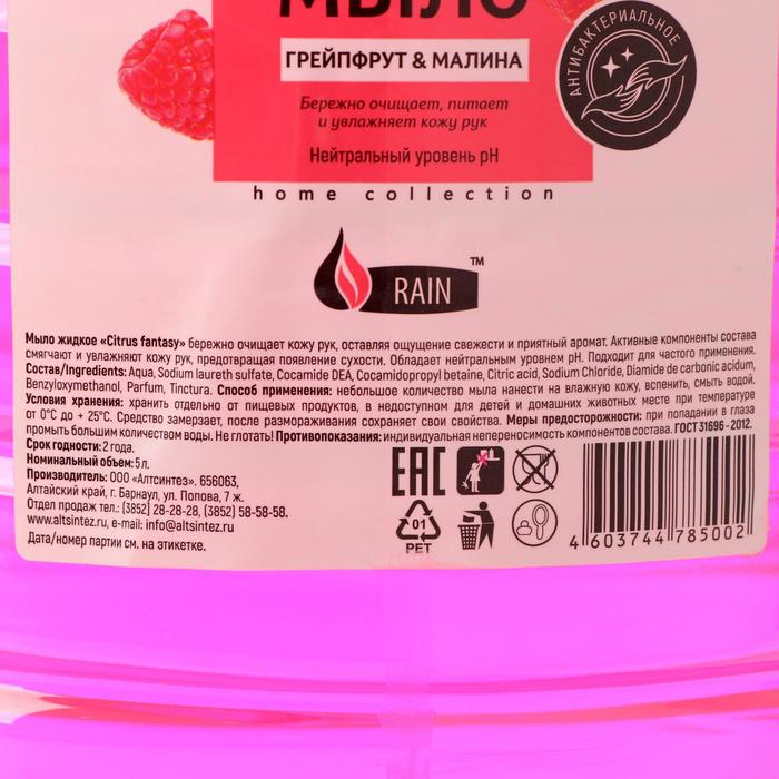 Жидкое крем-мыло Rain, антибактериальное, Грейпфрут-Малина, ПЭТ, 5 л